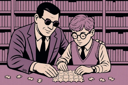 Un adulto non vedente e un bambino autistico collaborano su un puzzle: simbolo dell’inclusione reciproca e della forza delle relazioni solidali